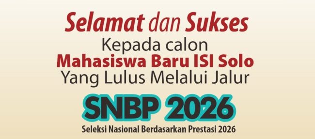 Registrasi peserta lulus seleksi jalur SNBP ISI Surakarta tahun 2026 diakses melalui laman https://sipadu.isi-ska.ac.id/snbp/ Unduh pengumuman: https://sipadu.isi-ska.ac.id/snbp/dokumen/Pengumuman_125_Registrasi_Lolos_SNBP_2026.pdf